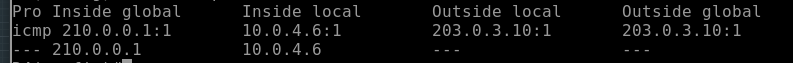 This output shows that the internal host 10.0.1.2 is being translated to the public address 203.0.1.1 when communicating with the external host 8.8.8.8.
