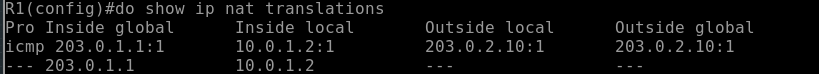 In this example, R1 will translate the inside host 10.0.1.2 (R2) to the public address 203.0.1.1.